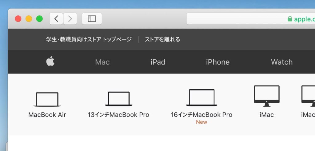 ちなみに、iPhoneやApple Watch・整備済み製品などのサイトにもこのまま行けますが割引にはならず、MacとiPadだけが割引の対象なので注意してください。